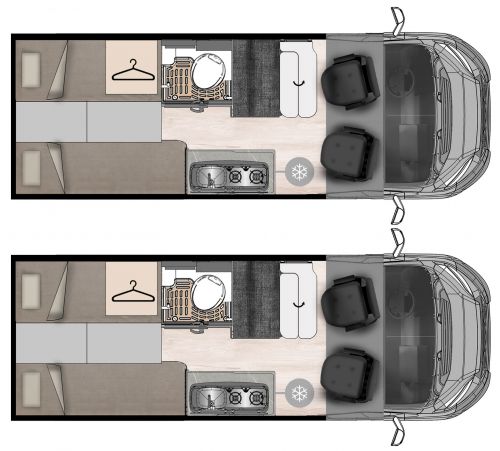 Dos camas longitudinales en la parte trasera con posibilidad de plegar ambas o una de ellas.