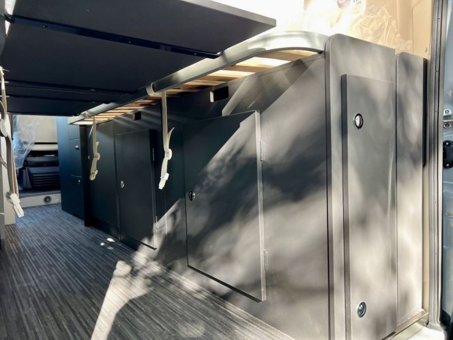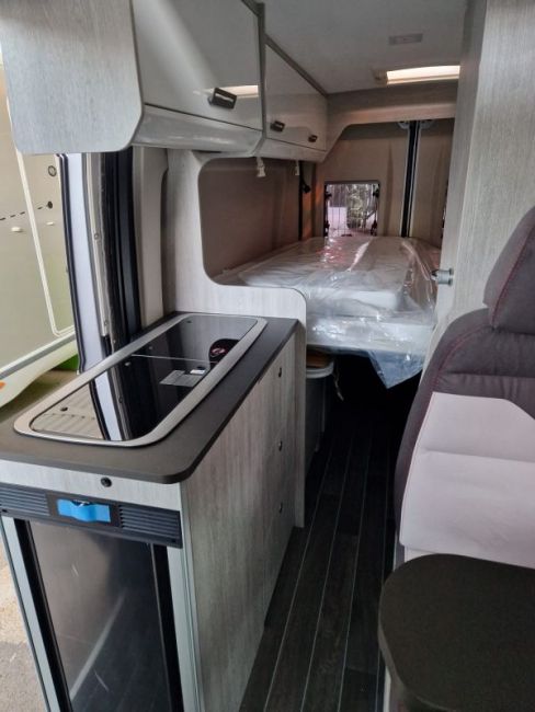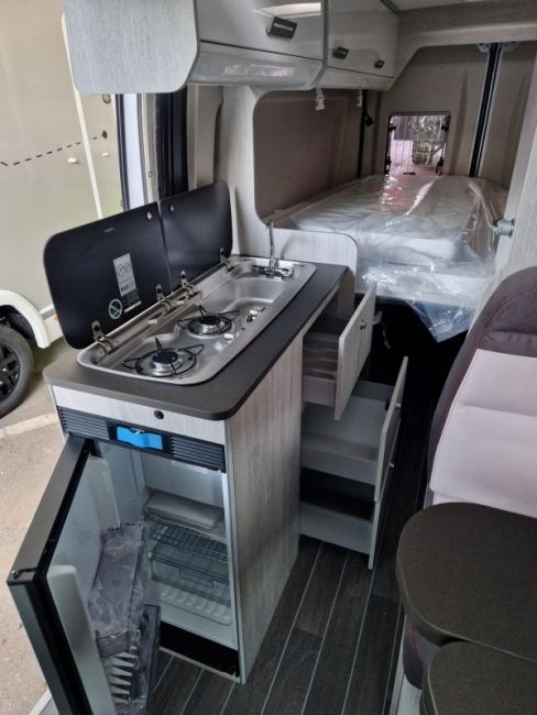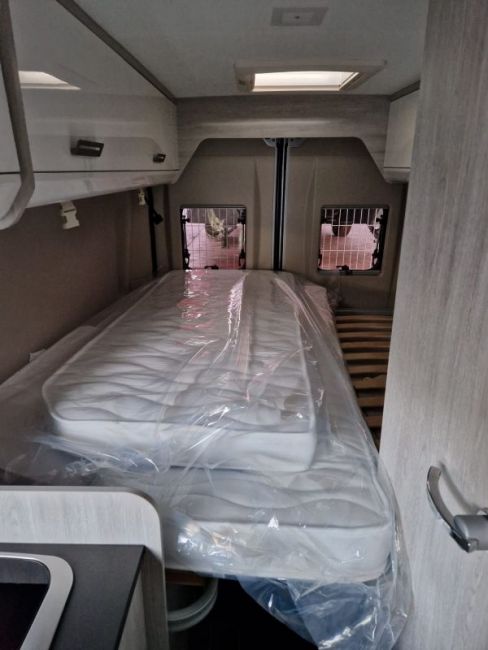 Autocaravana tipo camper. 2 plazas para dormir en camas gemelas longitudinales que se pueden unir en una sola cama transversal. Cuatro plazas homologadas para viajar.